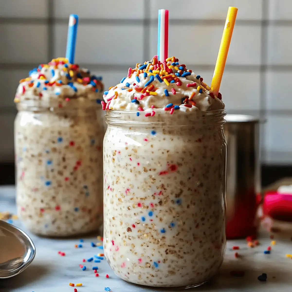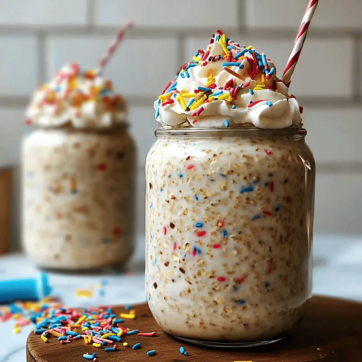 These Birthday Cake Overnight Oats are perfect for meal prep, allowing you to enjoy a festive breakfast without the morning rush! You can prepare the oats up to 24 hours in advance by mixing all the ingredients as instructed and storing them in an airtight container in the refrigerator. The key to maintaining quality is to keep them refrigerated; they’ll thicken beautifully while the flavors meld. When you’re ready to serve, simply give them a good stir and add a splash of almond milk if they've thickened too much overnight. This way, you can savor a delightful and nutritious breakfast with minimal effort, perfect for busy mornings!