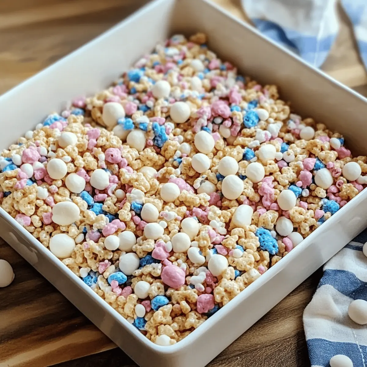 Prepare a 9x13-inch baking dish by lightly buttering it to prevent sticking. Transfer the sticky mixture into the dish and use a spatula to press it down firmly and evenly. The key is to make sure the mixture is compact and smooth, which helps the Cake Batter Rice Krispie Treats hold their shape once set. Take your time to spread it out evenly!