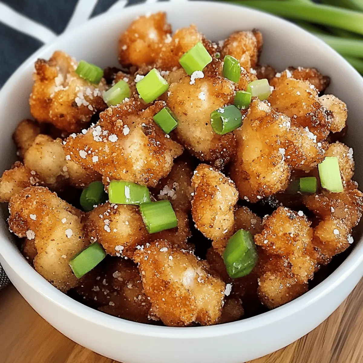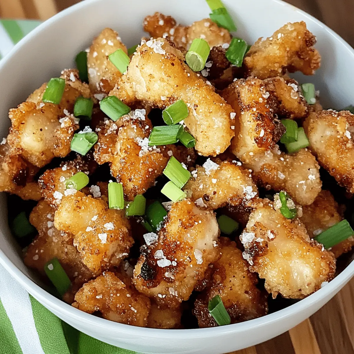 Once the chicken has finished frying, toss it in a bowl with salt and pepper to enhance the flavor. Garnish with chopped green onions for a fresh touch. Serve your Crispy Salt and Pepper Chicken hot, paired with your favorite sides like steamed jasmine rice or stir-fried vegetables for a delightful meal.