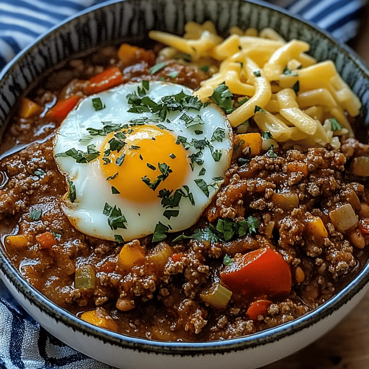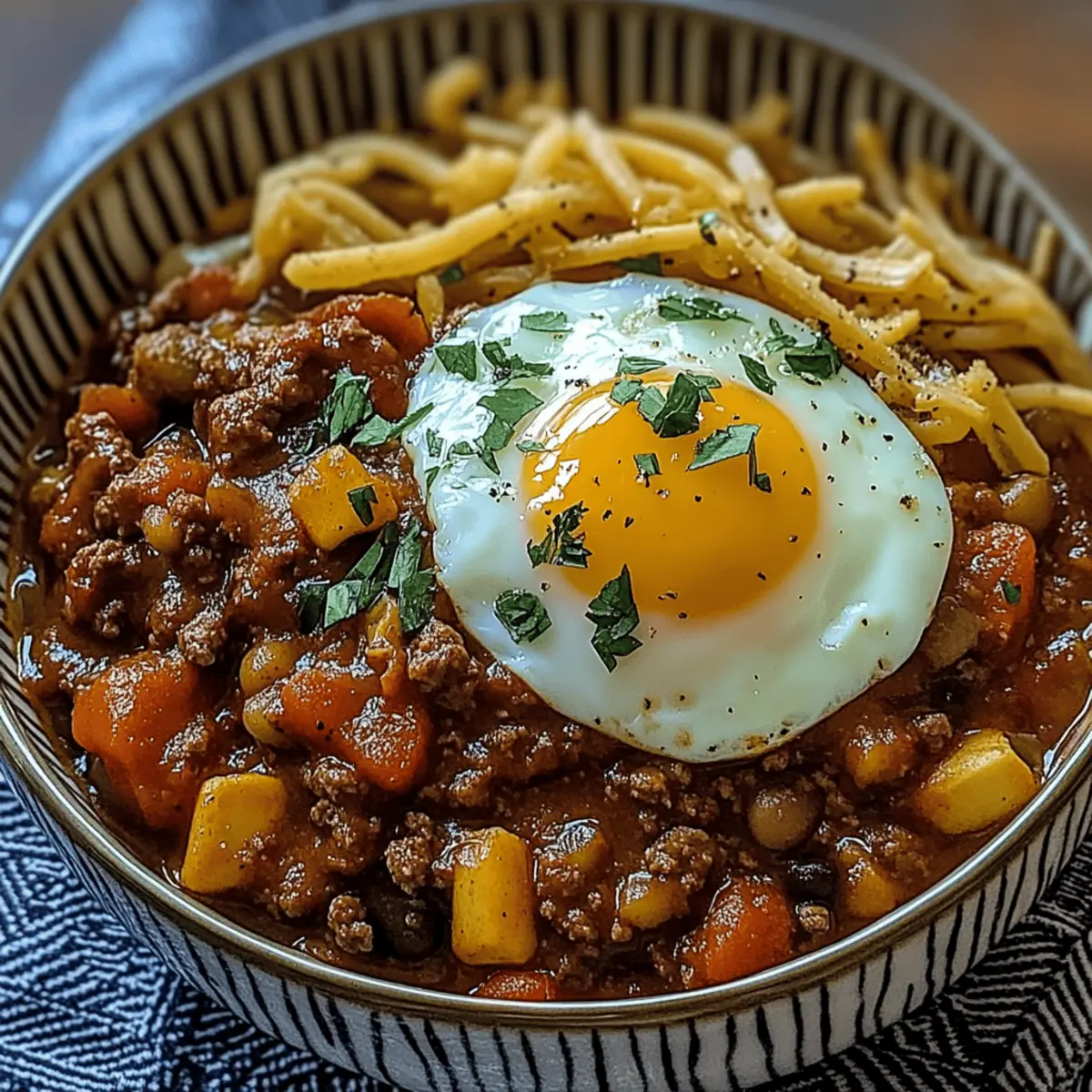 Once the chili has thickened and developed rich flavors, ladle it into bowls and carefully top each serving with a fried egg. Garnish with optional cheese or avocado slices if desired. Gather around the table and savor this comforting dish that blends breakfast favorites with hearty chili warmth.