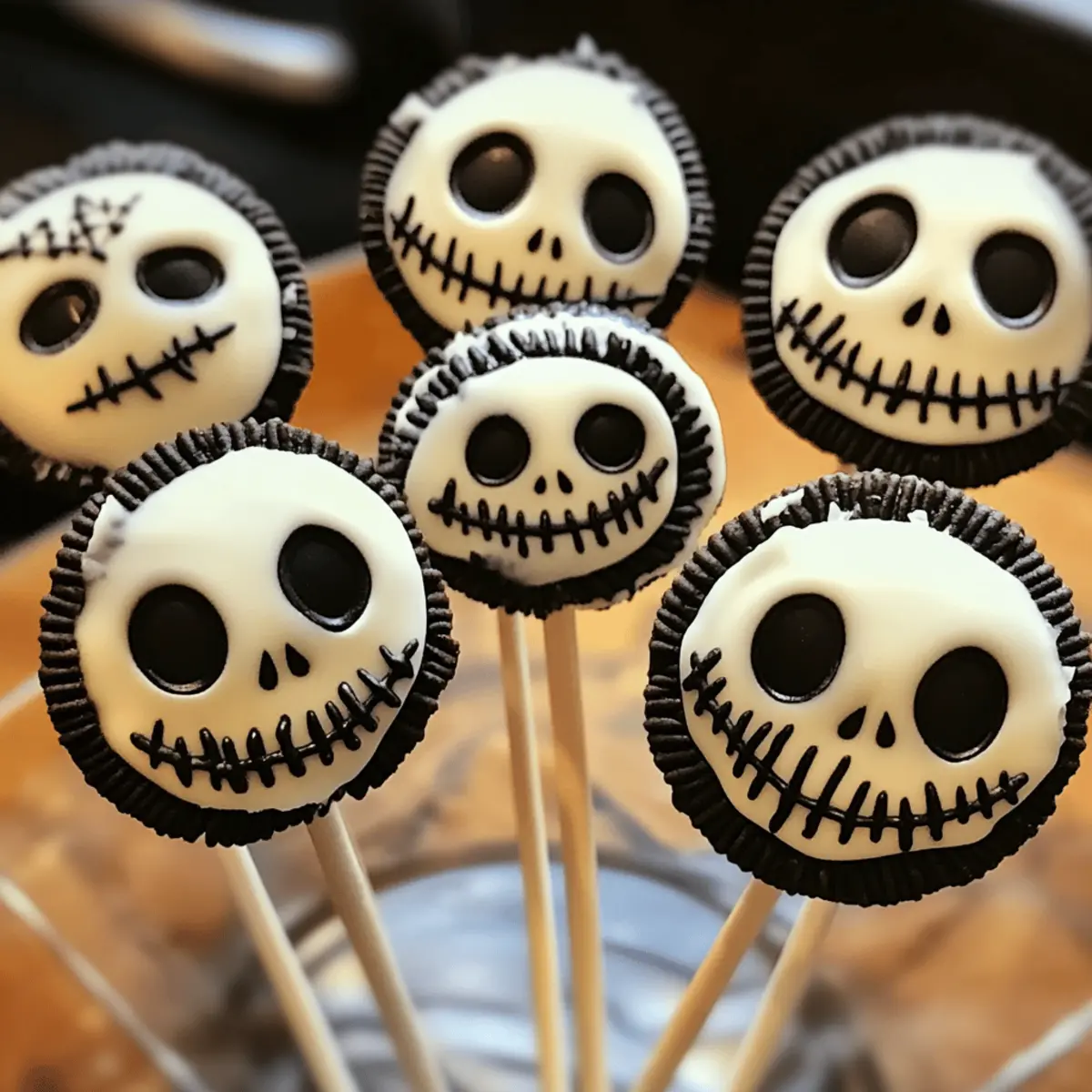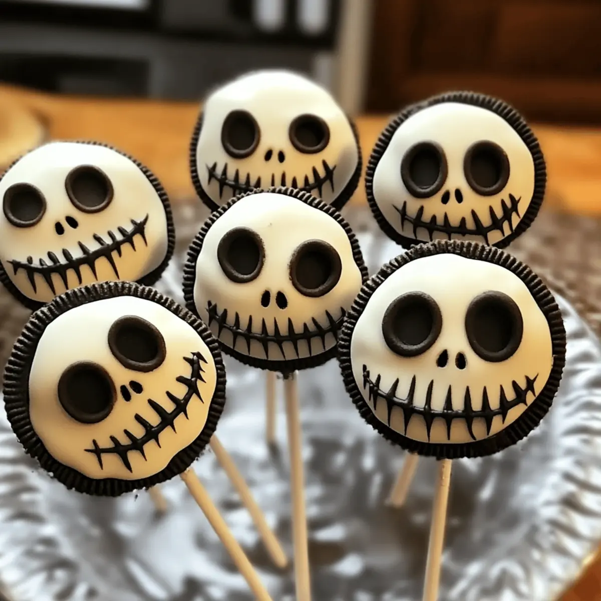 To add a festive flair to your Jack Skellington Oreo Pops, tie a black ribbon around the base of each stick. This not only enhances their Halloween charm but also makes them easy to handle. Now they’re ready to delight friends and family at your spooky gatherings!