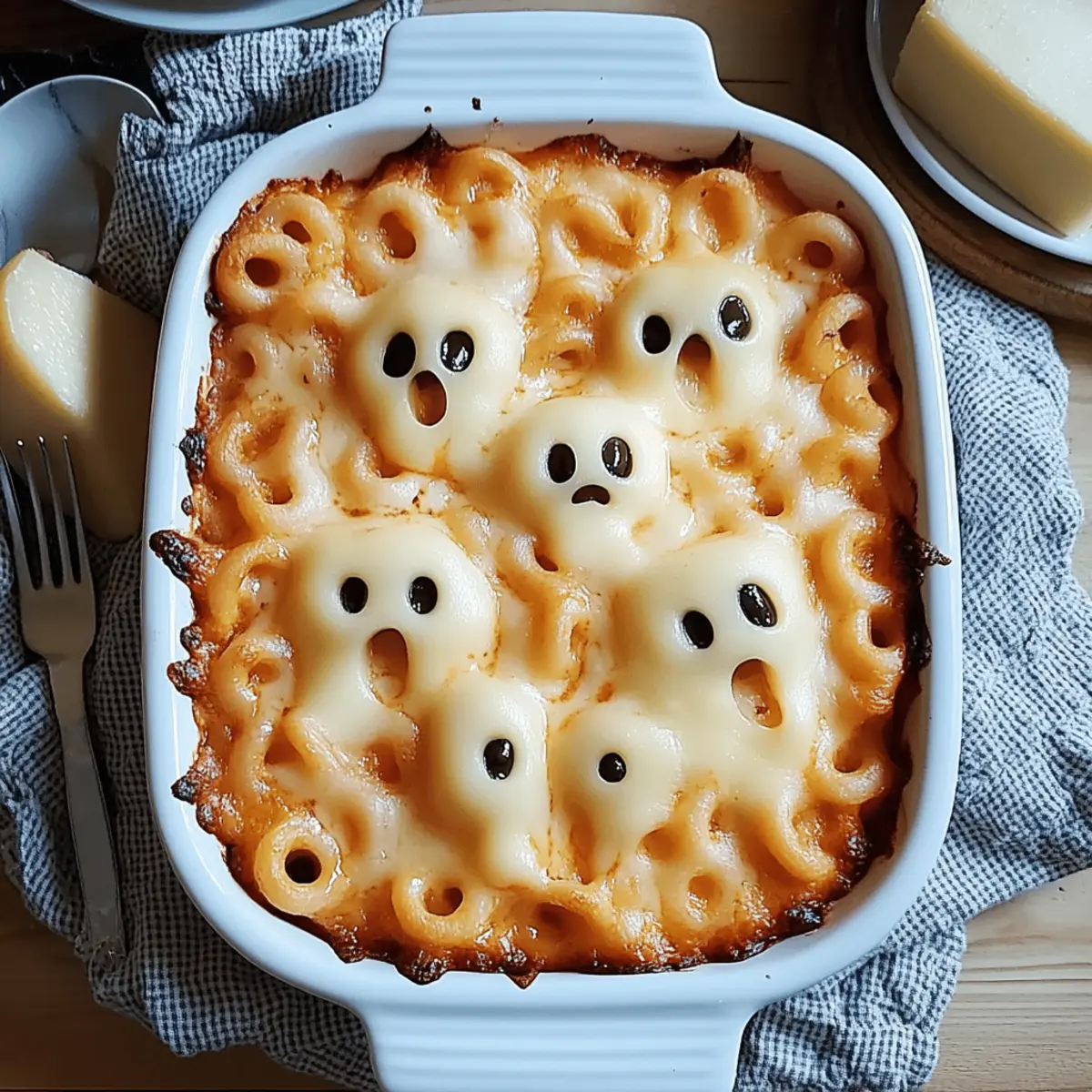 Slice the mozzarella cheese into fun ghost shapes and arrange them on top of the pasta in the baking dish. Press them down slightly to ensure they meld into the mixture as they cook. For added fun, use black sesame seeds or peppercorns to create little eyes on your cheese ghosts, bringing your Ghoul-gheroni and Cheese to life in a playful Halloween style.