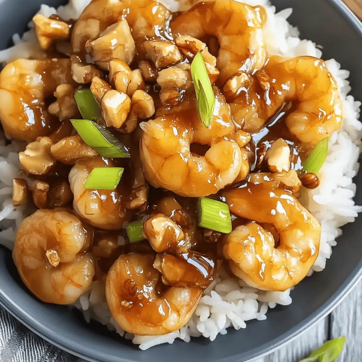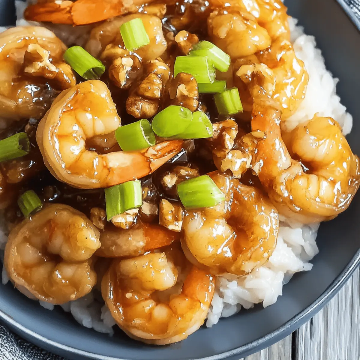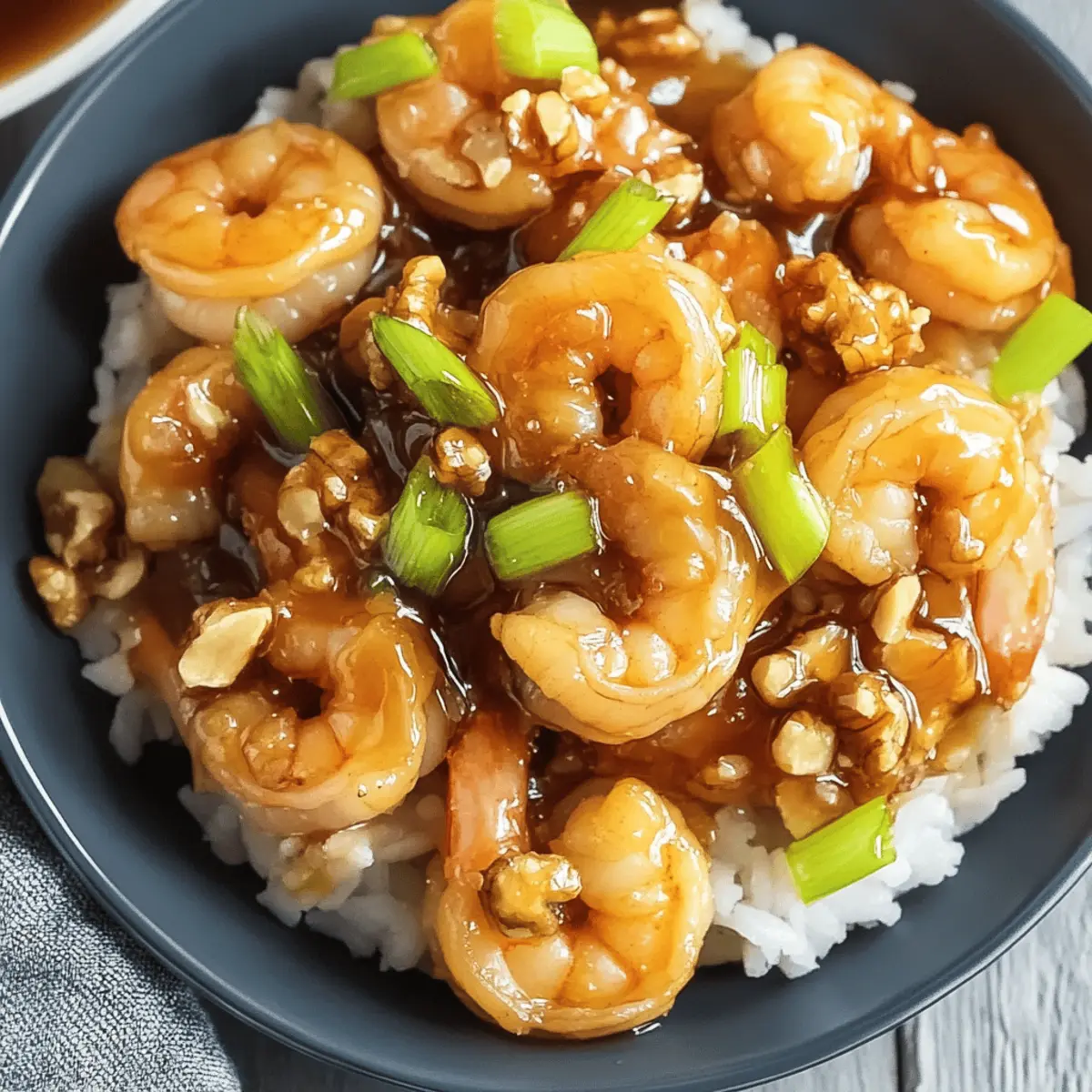 - Sprinkle the candied walnuts over the sauced shrimp and serve hot.