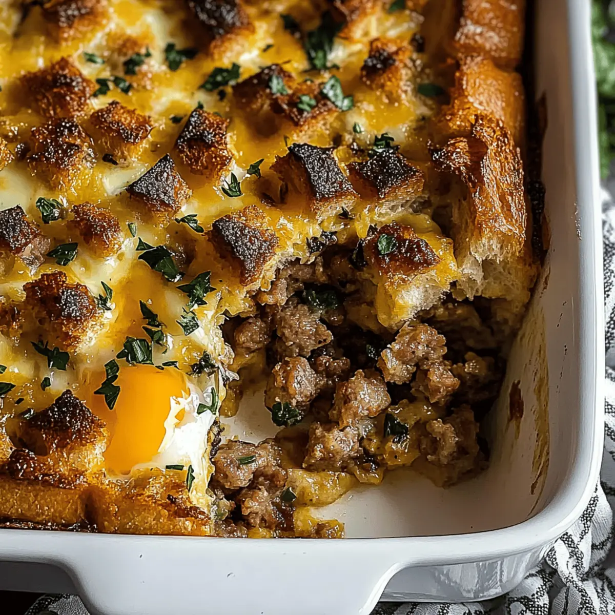 As I stood in my kitchen, the aroma of sizzling sausage mixed with the sound of eggs bubbling quietly in the oven transported me back to cherished Sunday mornings with family. This Savory Egg, Sausage, and Bread Casserole has become my go-to recipe for those leisurely brunches where comfort meets convenience. Not only is it a crowd-pleaser that transforms stale bread into a satisfying, protein-packed delight, but with its customizable nature, you can easily cater to any dietary need—yes, gluten-free options included! Whether you're prepping for a busy day ahead or gathering loved ones around the table, this dish promises to deliver warmth and a sense of togetherness. Curious to discover the simple steps to create this hearty masterpiece? Let’s dive in!