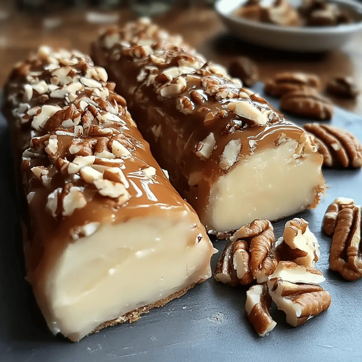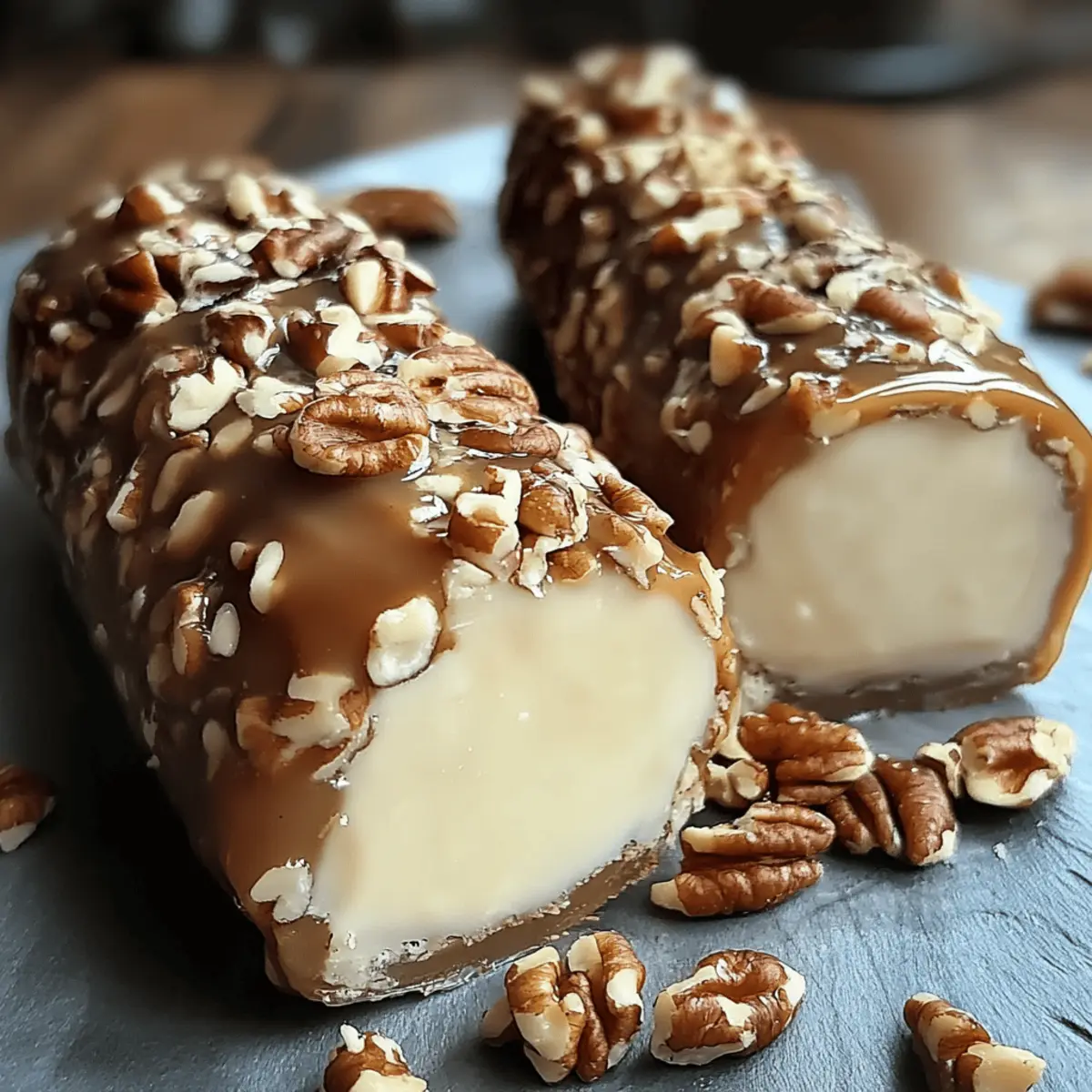 Once the logs are firm and the caramel is melted, carefully dip each frozen log into the caramel, ensuring they are completely coated. Allow any excess caramel to drip off before placing them back on a parchment-lined surface. This will create a gorgeous, glossy finish on your homemade Pecan Log Roll.