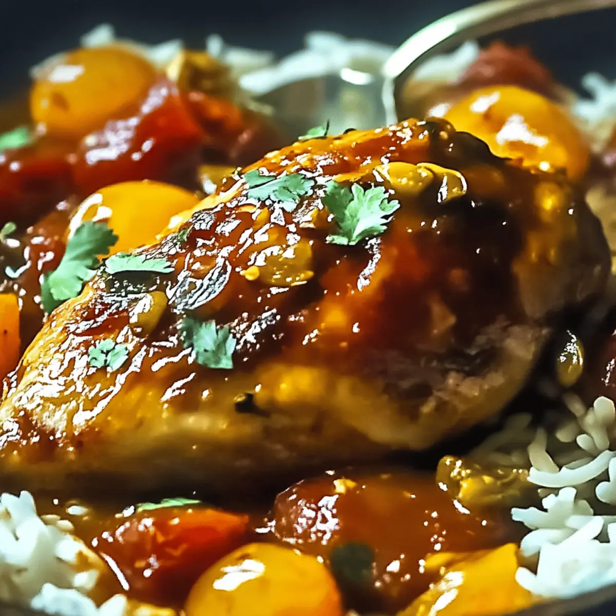 Transfer the chicken to a serving platter, spooning the rich sauce and dried fruits over the top. Garnish generously with fresh parsley or cilantro for extra flavor and a pop of color. Your Savory Persian Chicken is now ready to be enjoyed!
